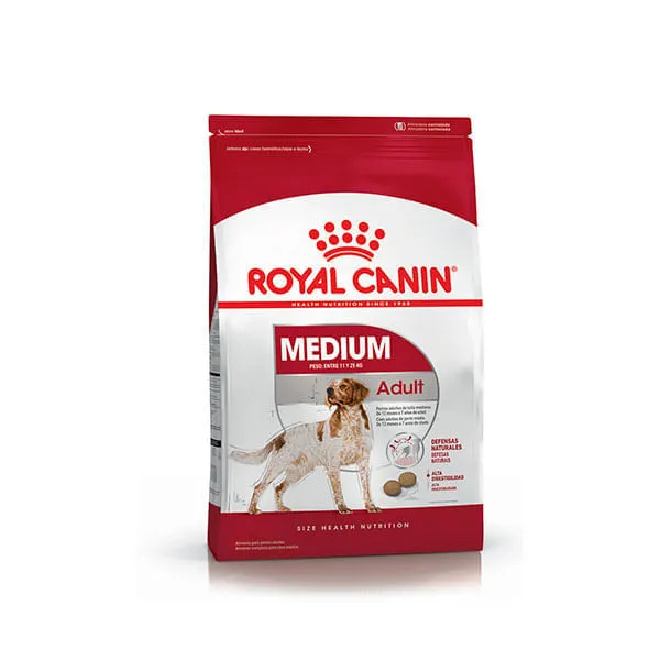 Royal Canin Medium Adult está formulado especialmente para perros adultos de razas medianas (entre 11 y 25 kg) de 12 meses a 7 años. Brinda una nutrición balanceada que refuerza el sistema inmunológico, mantiene la salud de la piel y el pelaje, y favorece una digestión óptima.