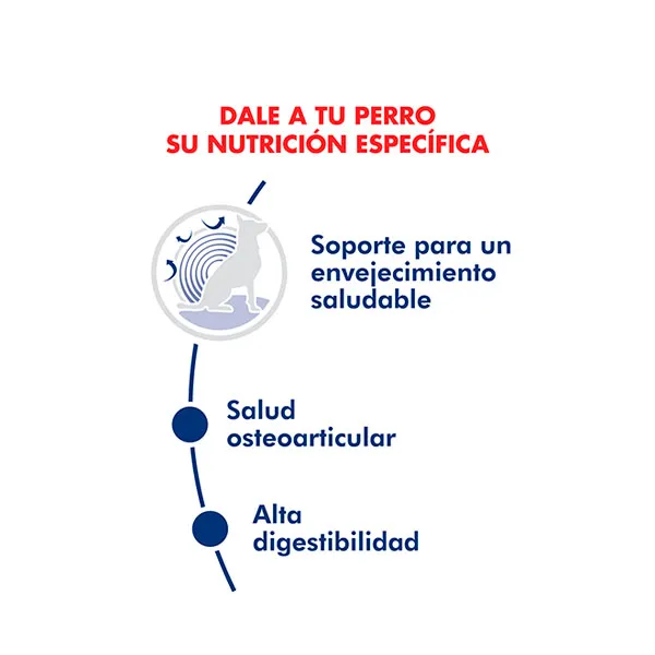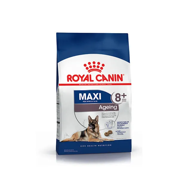 Royal Canin Maxi Ageing 8+ está especialmente formulado para perros de razas grandes (entre 26 y 44 kg) a partir de los 8 años de edad. Su fórmula ayuda a combatir los signos del envejecimiento, protegiendo articulaciones, corazón y sistema digestivo, mientras mantiene su vitalidad y calidad de vida.