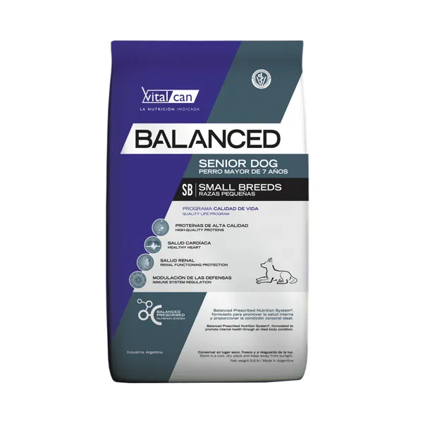 Vitalcan Balance Senior está formulado especialmente para perros de razas pequeñas mayores de 7 años, acompañando esta etapa con una nutrición equilibrada que ayuda a mantener su energía, proteger sus articulaciones y favorecer la digestión.