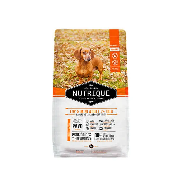 Nutrique Toy & Mini Adult +7 está especialmente formulado para perros mayores de razas pequeñas y toy, proporcionando una nutrición adaptada a las necesidades de los perros senior. Con ingredientes que favorecen la salud articular, cognitiva y digestiva, este alimento ayudará a tu perro a mantenerse activo, saludable y cómodo a medida que envejece.