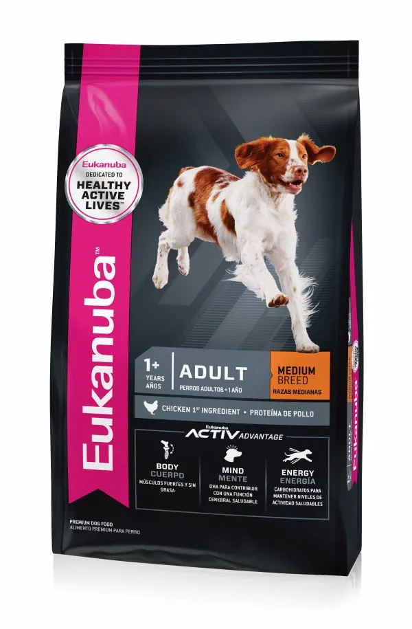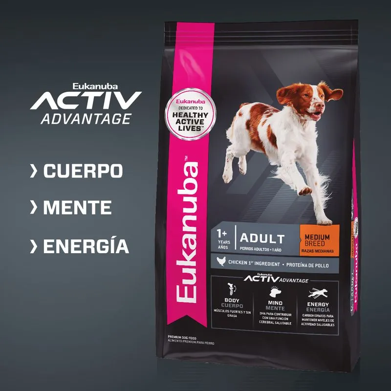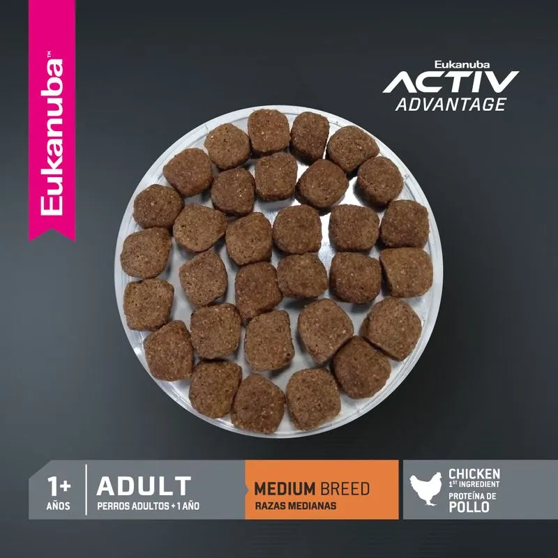 Eukanuba Adulto Mediano está especialmente formulado para perros adultos de razas medianas. Su fórmula balanceada con proteínas de alta calidad, ácidos grasos esenciales y antioxidantes ayuda a mantener la vitalidad y la salud muscular durante toda la vida.