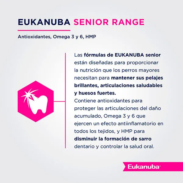 Eukanuba Senior Grande está formulado para perros grandes en su etapa senior. Su mezcla especial de proteínas, glucosamina y antioxidantes ayuda a mantener la movilidad articular, una piel sana y una digestión eficiente en la edad avanzada.