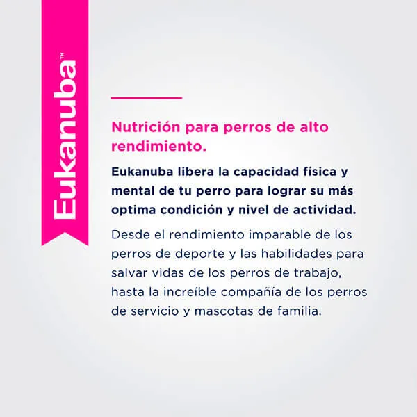 Eukanuba Adulto Pequeño está formulado para perros adultos de razas pequeñas. Con proteínas animales de alta calidad y nutrientes esenciales, ayuda a mantener un peso saludable, así como la salud de los huesos, piel y pelaje.