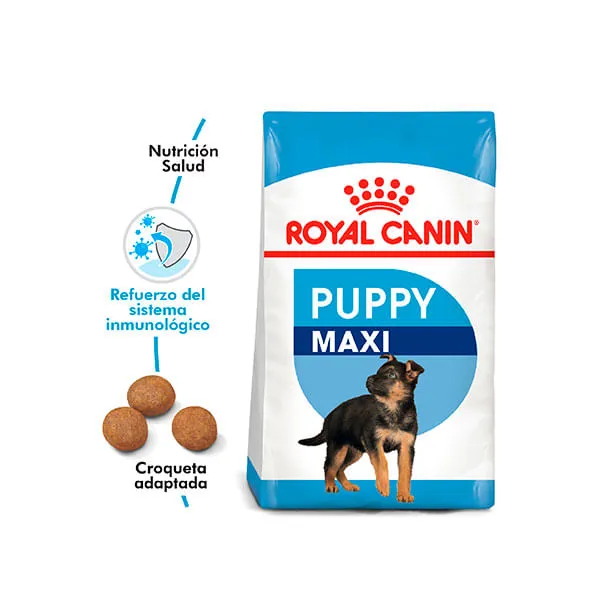 Royal Canin Maxi Puppy está formulado para cachorros de razas grandes (peso adulto entre 26 y 44 kg), desde los 2 hasta los 15 meses de edad. Acompaña su largo y exigente proceso de crecimiento con una nutrición completa que protege las articulaciones, refuerza el sistema inmunológico y promueve una digestión saludable.