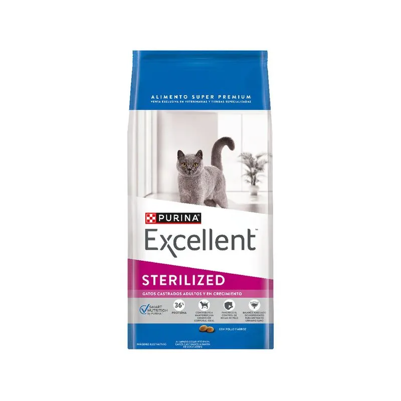 EXCELLENT Gato Castrado Sterilized está formulado para satisfacer las necesidades específicas de gatos castrados, ayudando a controlar el peso y promover la salud urinaria. Su fórmula equilibrada con proteínas de alta calidad y nutrientes esenciales favorece un metabolismo saludable y un pelaje brillante.