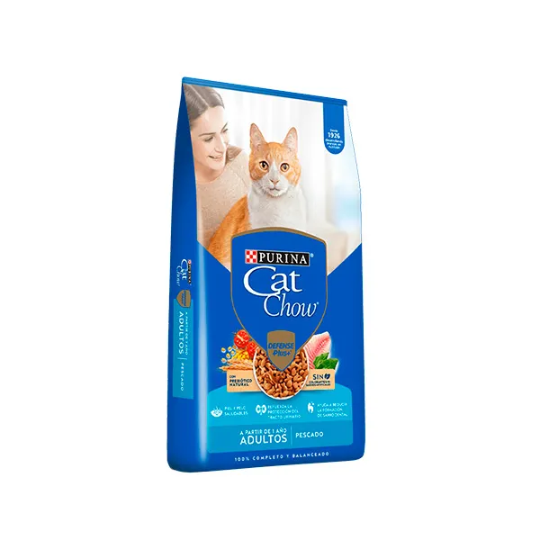 CAT CHOW Adulto Pescado y Pollo combina dos fuentes proteicas —el pescado, rico en ácidos grasos esenciales, y el pollo, altamente digestible— para brindar una alimentación balanceada que favorece una piel saludable, un pelaje brillante y una digestión eficiente.