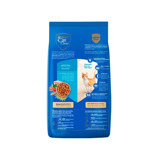 Gracias a la fórmula exclusiva PURINA® DEFENSE PLUS®, este alimento también refuerza el sistema inmunológico, ayudando a tu gato a mantenerse fuerte y activo todos los días.
