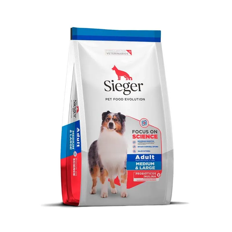 SIEGER Adult Medium & Large Breed está formulado para satisfacer las necesidades nutricionales específicas de perros adultos de razas medianas y grandes. Su fórmula equilibrada ayuda a mantener la masa muscular, la salud osteoarticular y una excelente condición física, adaptándose al metabolismo y tamaño de estas razas.