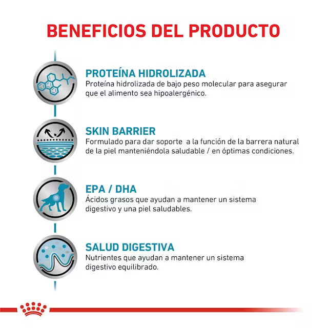 ROYAL CANIN Hypoallergenic es un alimento dietético completo diseñado para perros con alergias o intolerancias alimentarias. Formulado con proteínas hidrolizadas de bajo peso molecular, ayuda a reducir el riesgo de reacciones adversas y mejora la digestibilidad.