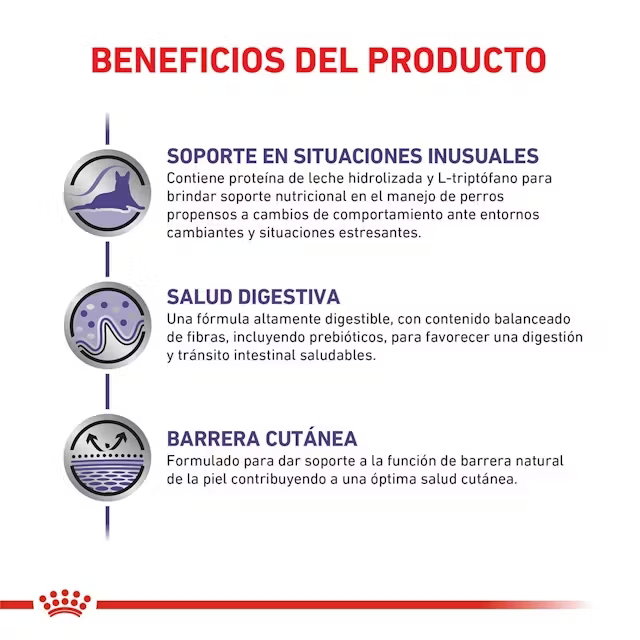 ROYAL CANIN Calm es un alimento dietético completo formulado para perros que enfrentan situaciones de estrés o ansiedad, como cambios de entorno, visitas al veterinario, viajes o convivencia con otros animales. Contiene hidrolizado de proteína de leche (caseína) y triptófano, un aminoácido precursor de la serotonina, que ayuda a mantener un comportamiento equilibrado.