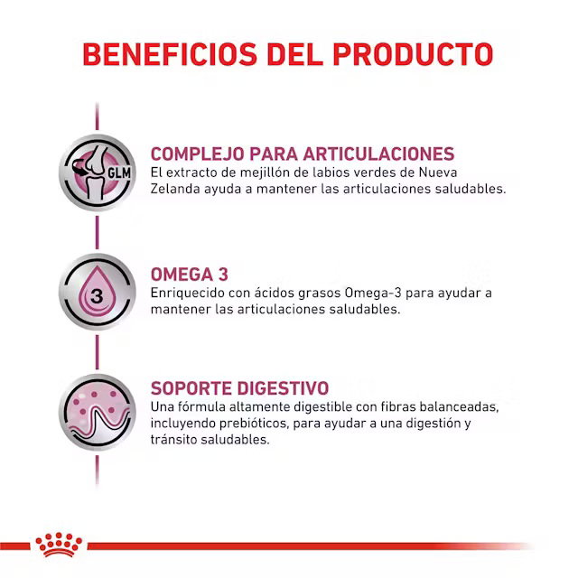 ROYAL CANIN Mobility Large Dog es un alimento dietético completo diseñado específicamente para perros de razas grandes que necesitan soporte en la salud articular y movilidad. Su fórmula contiene ingredientes clave como glucosamina, condroitina, EPA y DHA, que ayudan a proteger y mantener la integridad del cartílago y a reducir la inflamación en las articulaciones.