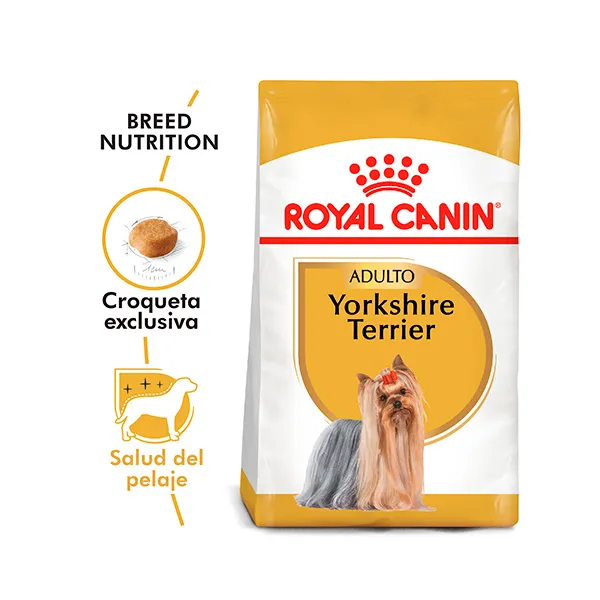 ROYAL CANIN Yorkshire Terrier Adulto es un alimento completo especialmente formulado para perros adultos de raza Yorkshire Terrier a partir de los 10 meses de edad. Su fórmula nutricional está diseñada para satisfacer las necesidades específicas de esta raza, contribuyendo a mantener un pelaje saludable, estimular el apetito y cuidar la salud bucodental.