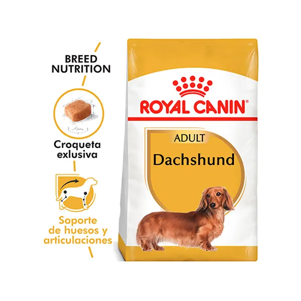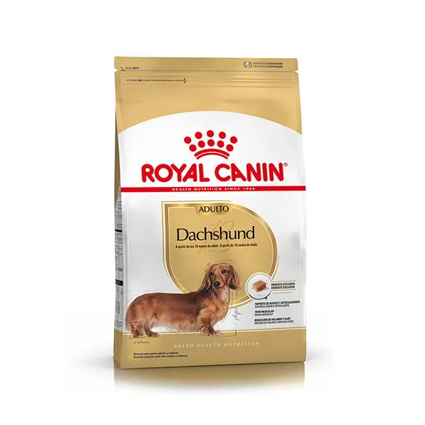ROYAL CANIN Dachshund Adulto es un alimento completo especialmente formulado para perros adultos de raza Dachshund (Teckel) a partir de los 10 meses de edad. Su fórmula nutricional está diseñada para mantener la salud muscular, cuidar las articulaciones y favorecer la digestión, considerando la conformación única y las necesidades específicas de esta raza.