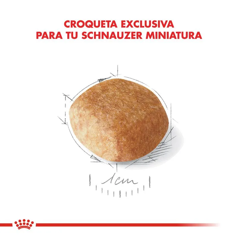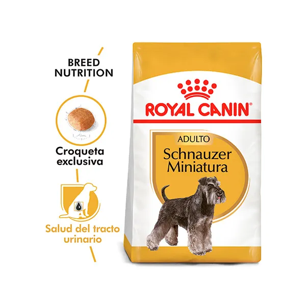 ROYAL CANIN Mini Schnauzer Adulto es un alimento completo formulado especialmente para perros adultos de raza Mini Schnauzer a partir de los 10 meses de edad. Su fórmula está diseñada para ayudar a mantener la salud de la piel y el pelaje, así como para apoyar la salud urinaria y la tonicidad muscular.