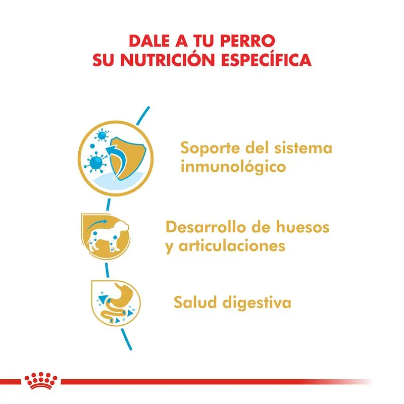 Contiene proteínas de alta calidad, antioxidantes y nutrientes esenciales que contribuyen al desarrollo muscular y al mantenimiento de un sistema inmunológico fuerte. Además, su croqueta está adaptada al tamaño y forma de la mandíbula del cachorro, facilitando la masticación y estimulando el apetito.