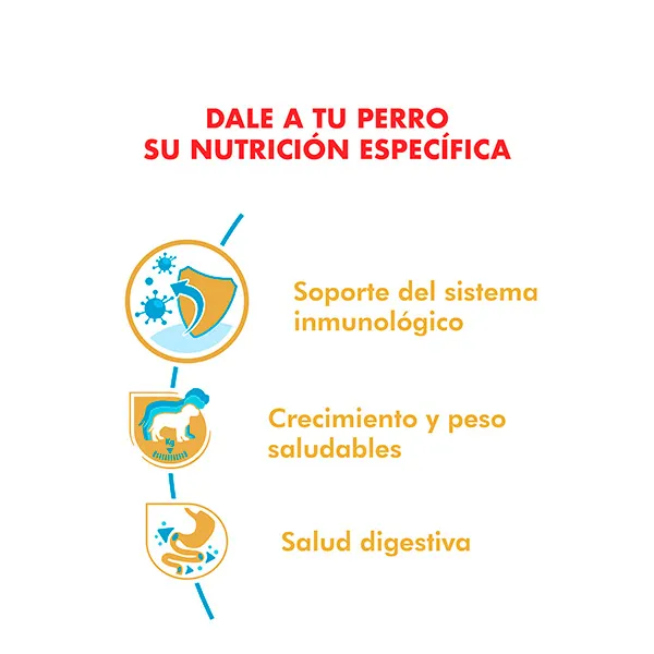 Enriquecido con proteínas de alta calidad, antioxidantes y ácidos grasos omega 3 (EPA y DHA), contribuye al desarrollo cognitivo, la salud articular y el mantenimiento de un pelaje sano y brillante. La croqueta está adaptada al tamaño y mandíbula de cachorros de raza grande, facilitando la masticación y estimulando el apetito.