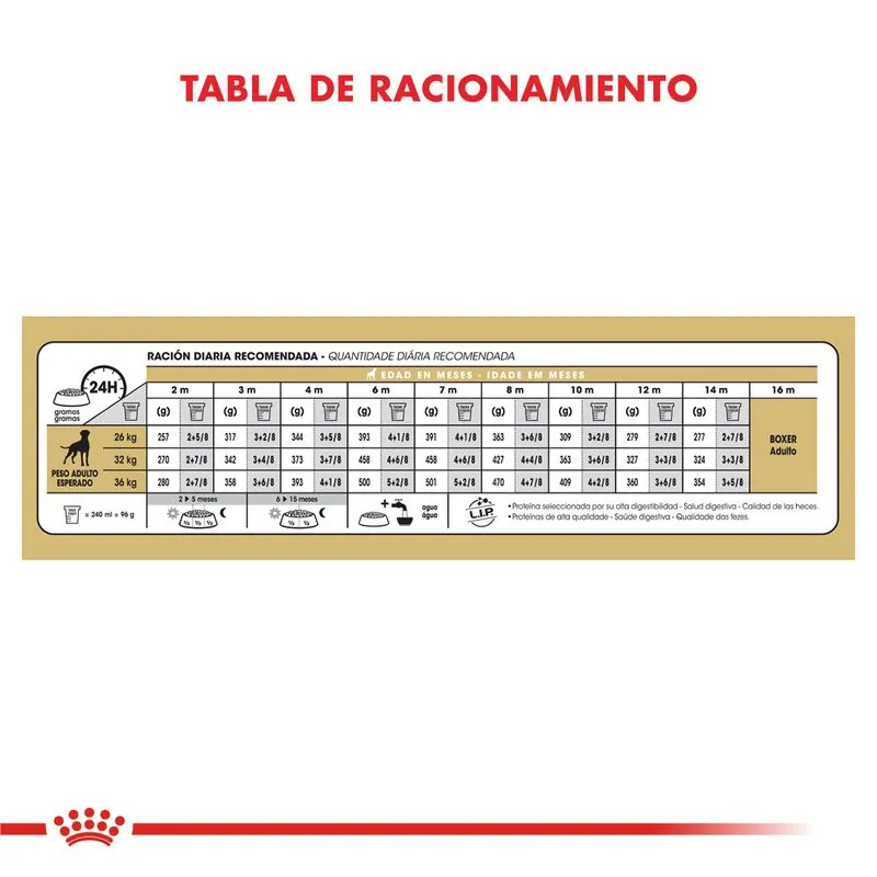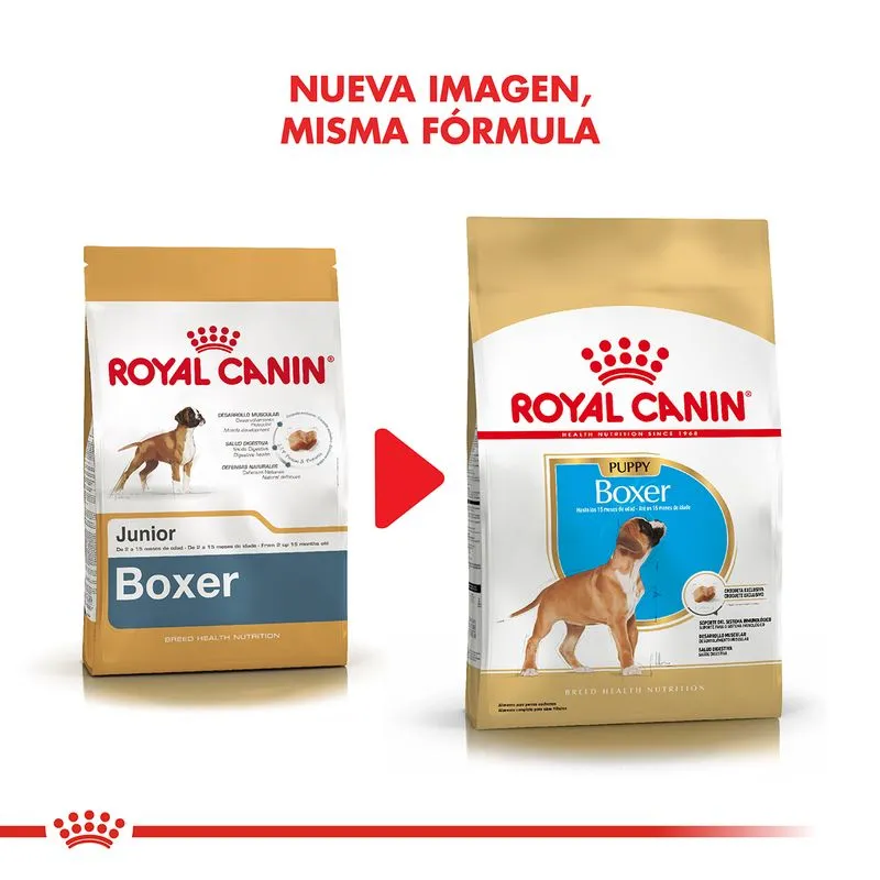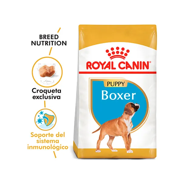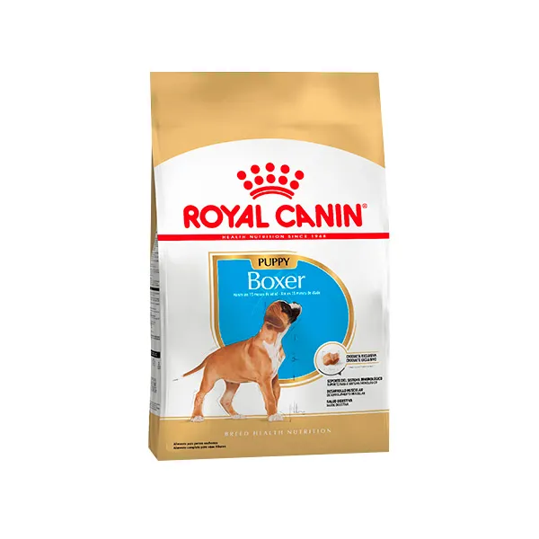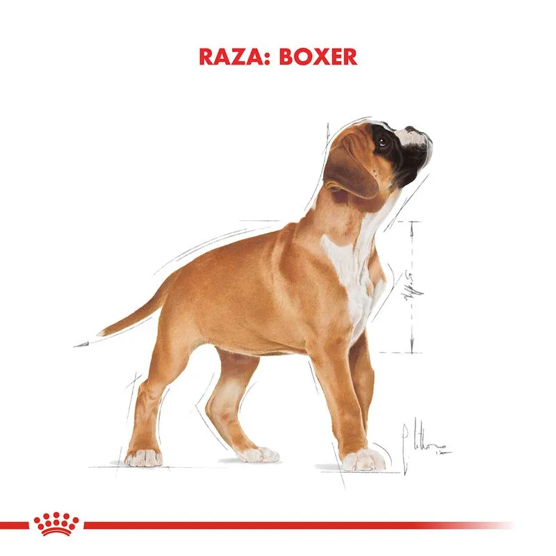 ROYAL CANIN Boxer Junior es un alimento completo y balanceado formulado especialmente para cachorros de raza Boxer desde los 2 hasta los 15 meses de edad. Su fórmula está diseñada para apoyar un crecimiento saludable, reforzar las defensas naturales y favorecer el desarrollo muscular y óseo adecuado en esta raza enérgica y musculosa.
