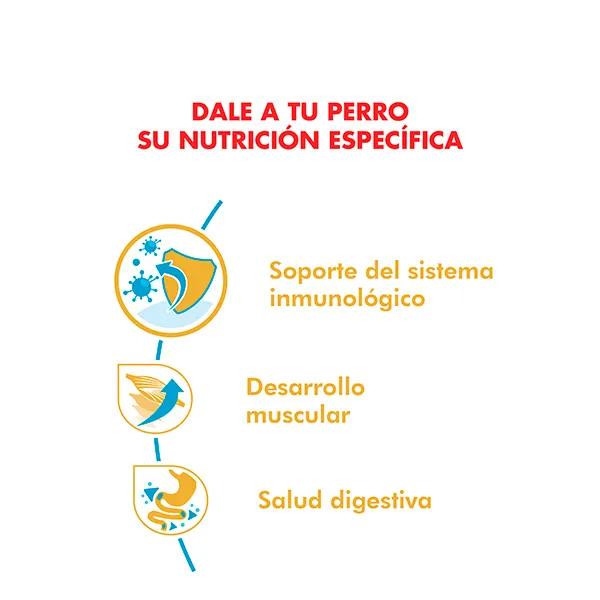 Enriquecido con proteínas de alta calidad, antioxidantes, ácidos grasos omega 3 (EPA y DHA) y nutrientes esenciales, contribuye al desarrollo cognitivo, la salud articular y el mantenimiento de un pelaje sano y brillante. La croqueta está adaptada al tamaño y mandíbula de cachorros de raza grande, facilitando la masticación y estimulando el apetito.