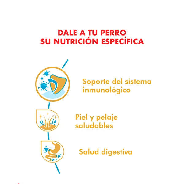 Enriquecido con proteínas de alta calidad, antioxidantes, ácidos grasos omega 3 (EPA y DHA) y nutrientes esenciales, contribuye al desarrollo cognitivo, la salud articular y el mantenimiento de un pelaje sano y brillante. La croqueta está adaptada al tamaño y mandíbula de cachorros de raza grande, facilitando la masticación y estimulando el apetito.