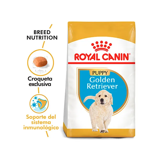 ROYAL CANIN Golden Junior es un alimento completo formulado especialmente para cachorros de raza Golden Retriever desde los 2 hasta los 15 meses de edad. Su fórmula está diseñada para apoyar un crecimiento saludable, reforzar las defensas naturales y favorecer el desarrollo muscular y óseo adecuado en esta raza activa y amigable.