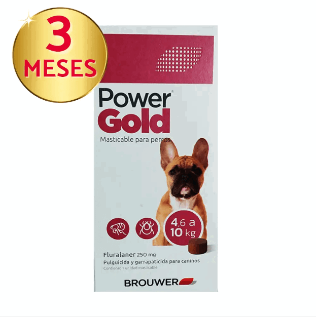 Power Gold es un antiparasitario oral de larga duración, diseñado para perros de 4,6 a 10 kg. Con una sola dosis, protege eficazmente contra pulgas y garrapatas durante hasta 3 meses.