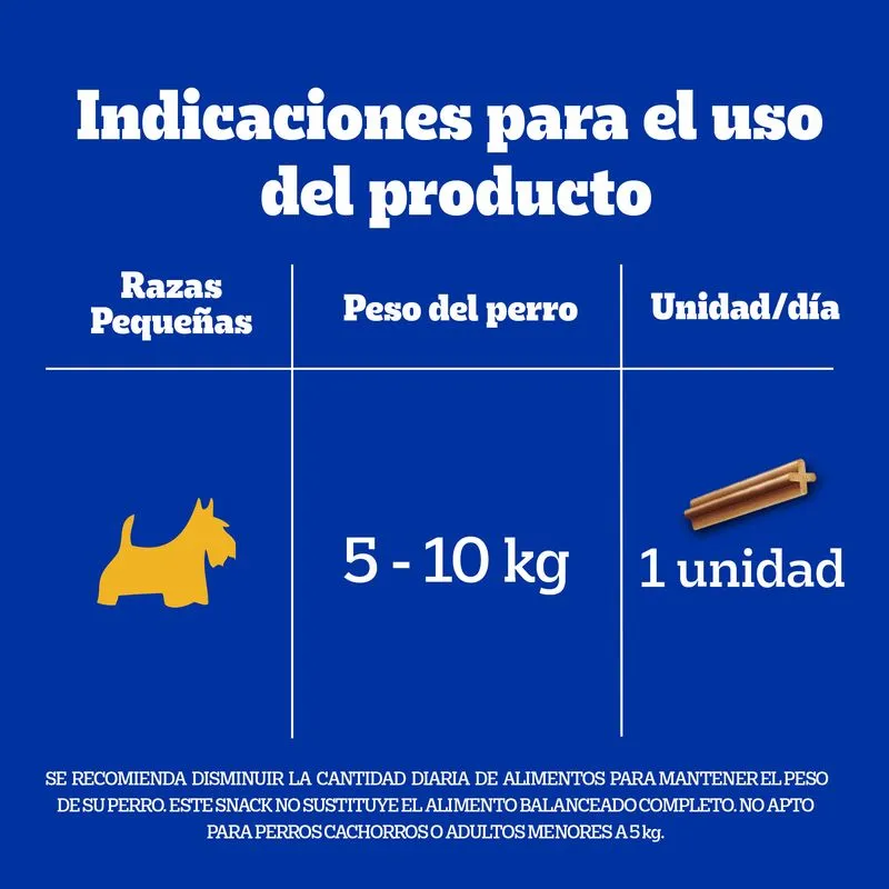 Con Dentastix Raza Chica x7, tu perro pequeño puede mantener una salud bucal óptima todos los días. Estas barras masticables, diseñadas para perros de hasta 10 kg, ayudan a reducir la formación de sarro y placa gracias a su textura en forma de “X”.