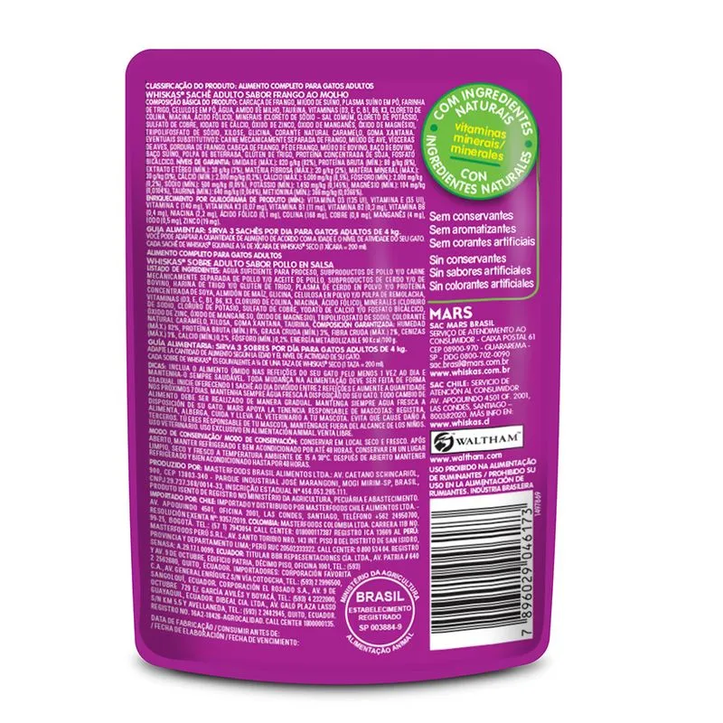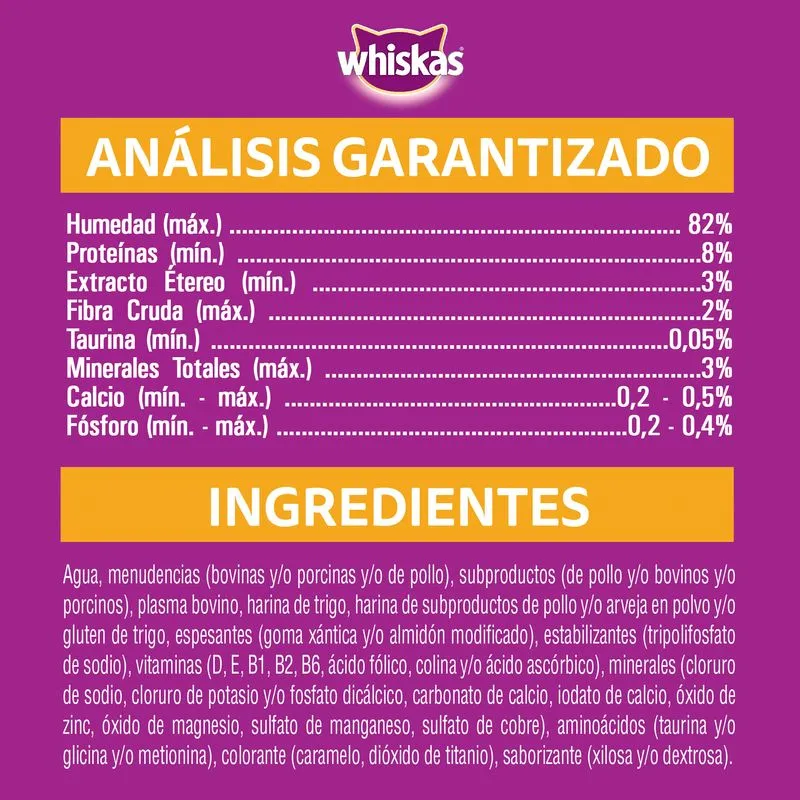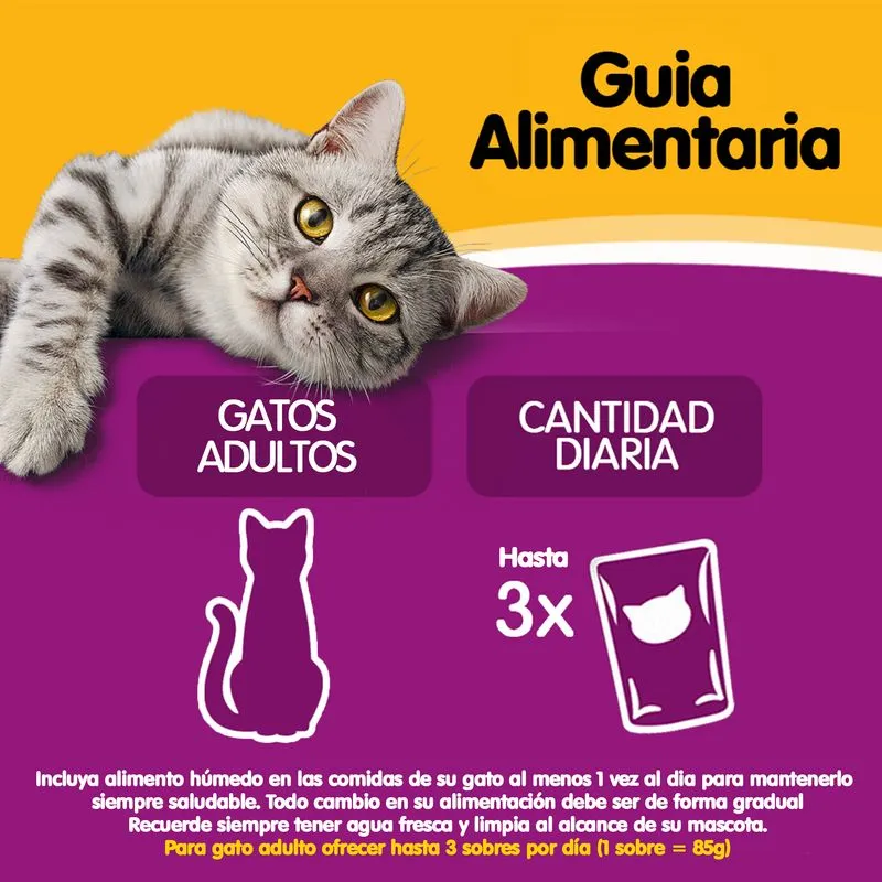Con Whiskas Pouch Adulto Pollo en Salsa, tu gato disfruta de una receta sabrosa y balanceada, con trocitos de pollo cocidos al vapor en una irresistible salsa. Este alimento húmedo está formulado para cubrir las necesidades nutricionales de los gatos adultos, aportando proteínas, vitaminas y minerales esenciales para mantener su vitalidad y bienestar.