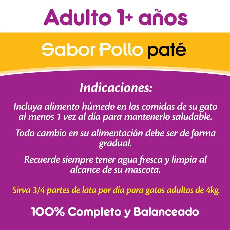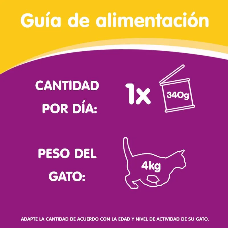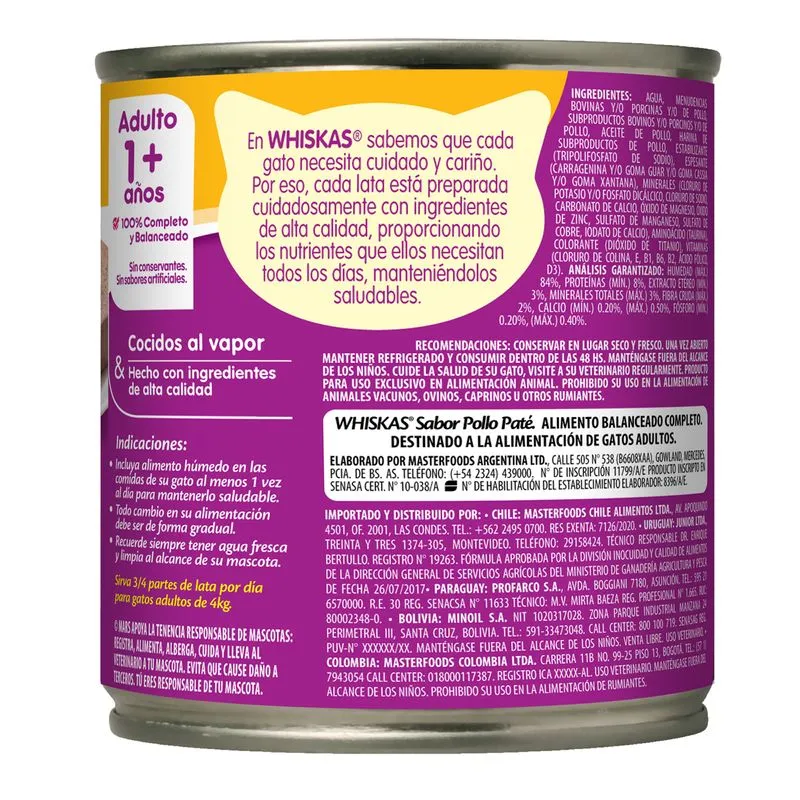 Con Whiskas Lata Adulto Pollo, tu gato disfruta de una receta húmeda deliciosa y equilibrada, elaborada con pollo cocido al vapor. Este alimento completo está formulado para cubrir las necesidades nutricionales de gatos adultos, aportando proteínas, vitaminas y minerales esenciales para su salud y vitalidad diaria.