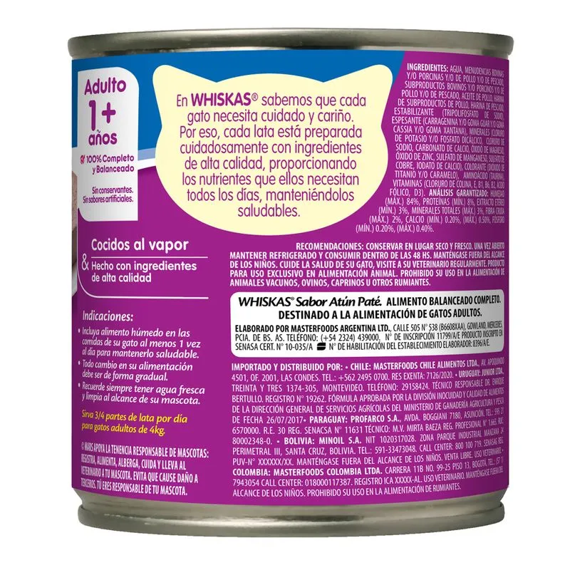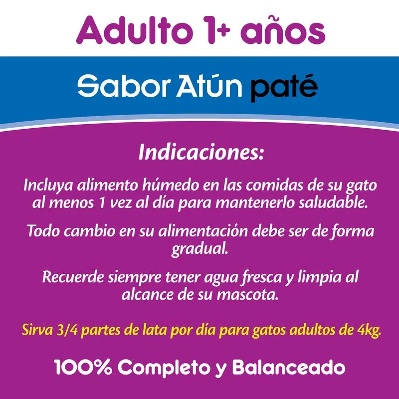 Con Whiskas Lata Adulto Atún, tu gato disfruta de una comida húmeda sabrosa y balanceada, elaborada con atún cocido al vapor. Esta receta aporta proteínas de calidad, vitaminas y minerales esenciales para mantener su salud, energía y bienestar durante la etapa adulta.